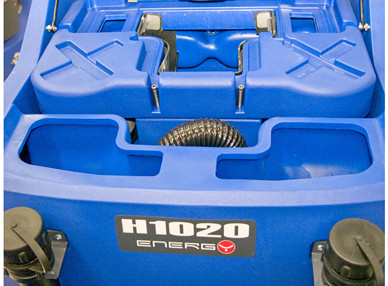 The recovery tank is placed inside the solution tank and has a capacity of 270 Lt. Great capacity and weight perfectly balanced. Easy access from top and bottom sides thanks to wide opening. 40 mm 0 discharge hose.