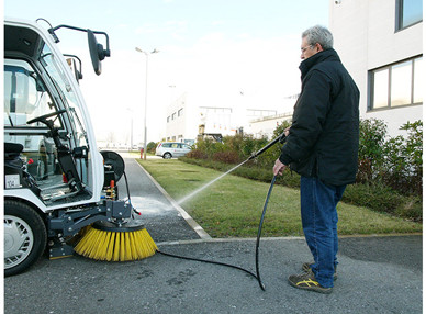 The two side brushes can be adjusted in speed and can be moved by the operator out of about 30 cm, in order to widen the working width of the machine. An additional suction hose (length 5 mt) allows to gather easily all those debris that cannot be collected in another way. The quantity of water used for the spraying system can be increased thanks to the recycle system. The water collected into the tank can be drown away by a tap.